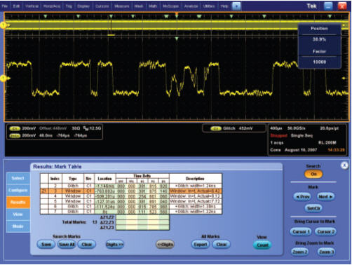 没有正确的检索工具的话,要在很长的波形记录中找到您感兴趣的事件可能会很耗时。如今,记录长度日渐超过100万数据点,要定位您的事件可能意味着需要浏览成千上万个信号活动屏。用软件搜索工具可简化对长记录的浏览。甚至有前置面板控制器,使您可快速进行缩放和平移操作,就像用DVR看视频一样。还可顺便自动标注每个定义事件的发生情况,以便在各事件之间快速移动。