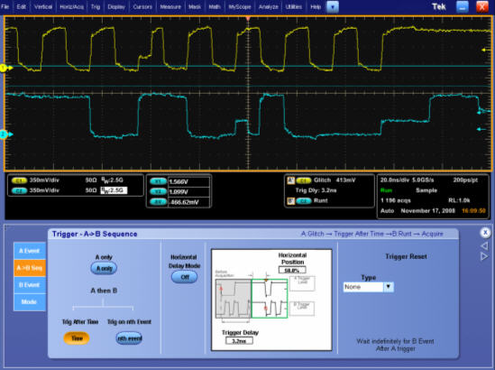 在高速调试应用中,您的电路可能会工作99.999%或更长的时间。而正是.001%的时间会造成您的系统崩溃或正是您需要更详细分析波形的一部分。高级触发功能,如AB双重事件触发、窗口触发、逻辑认证等等都有助于隔离问题,速度比在采集后搜索上百万个数据样本快很多。